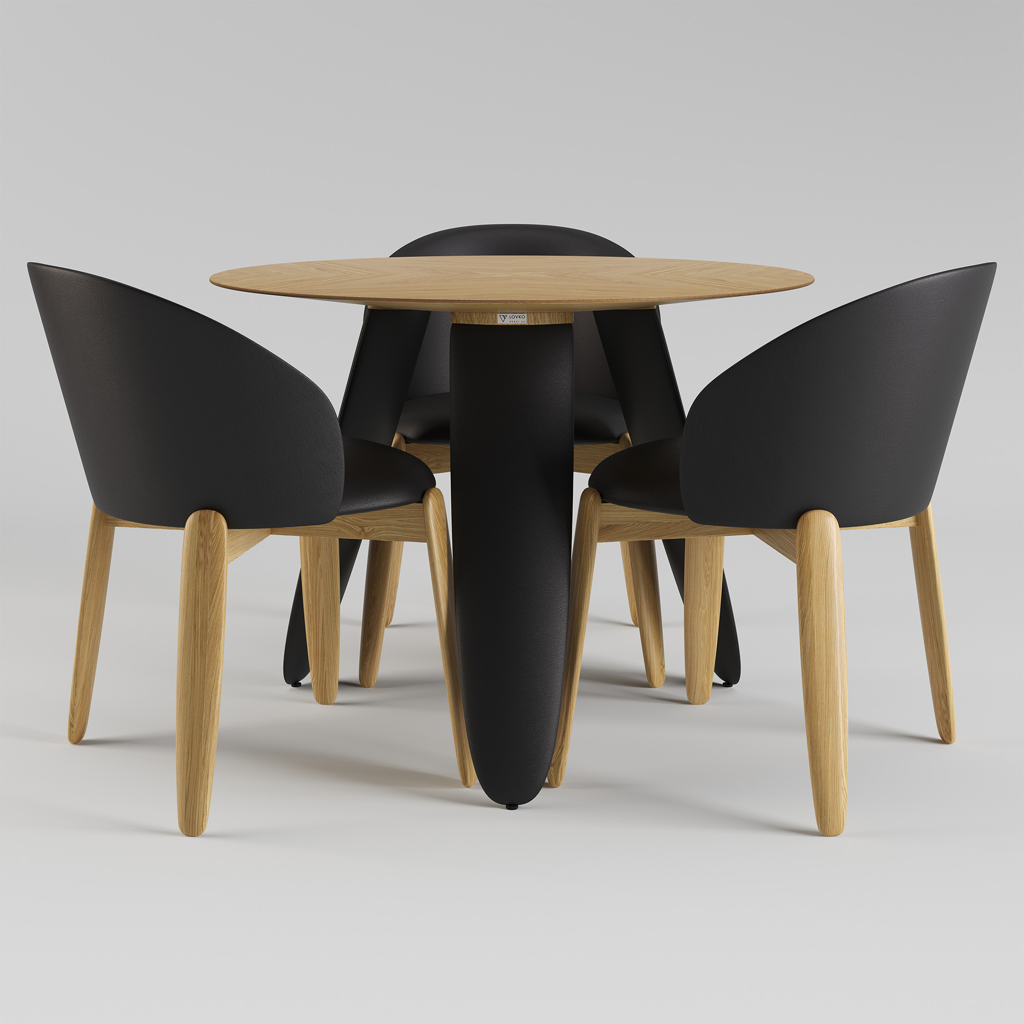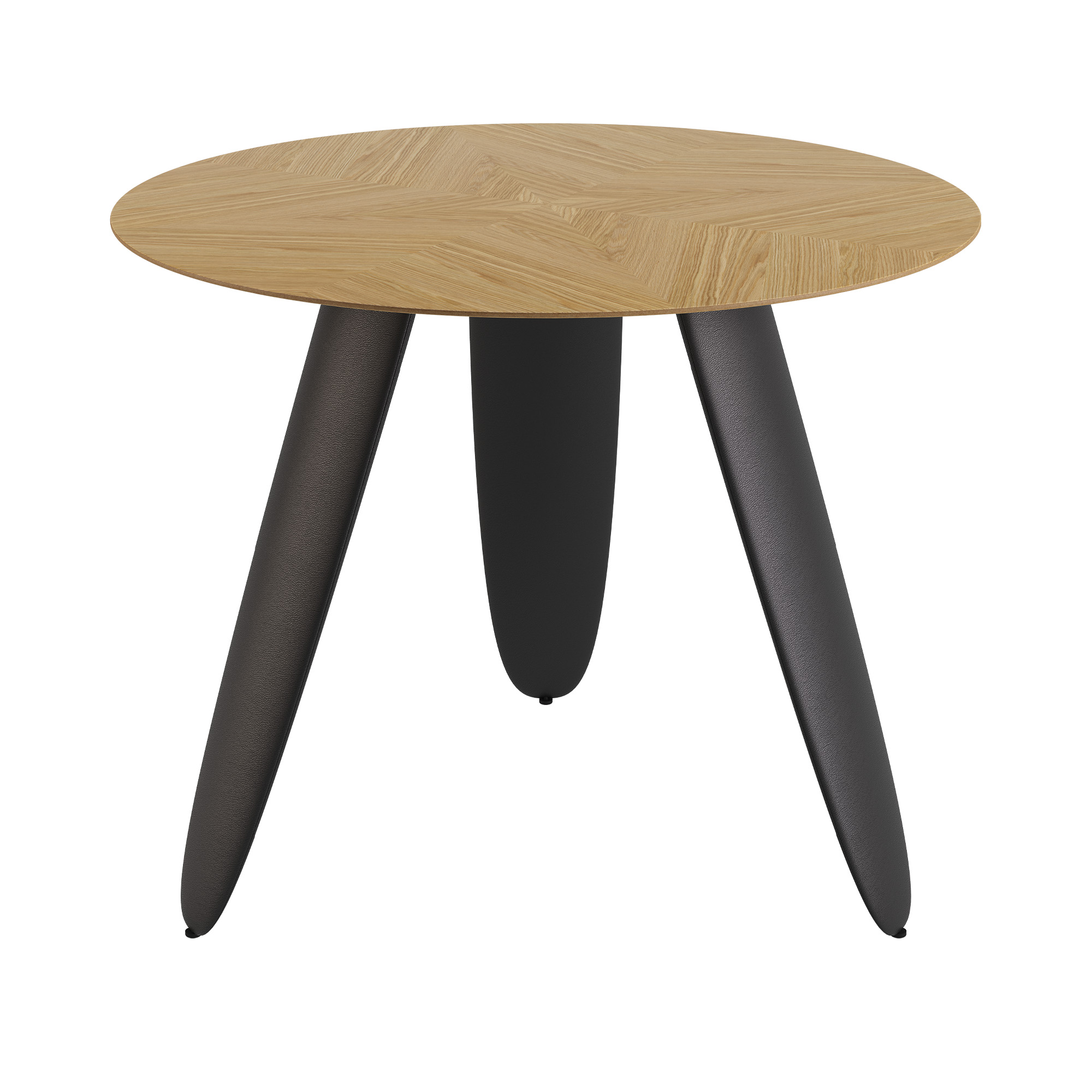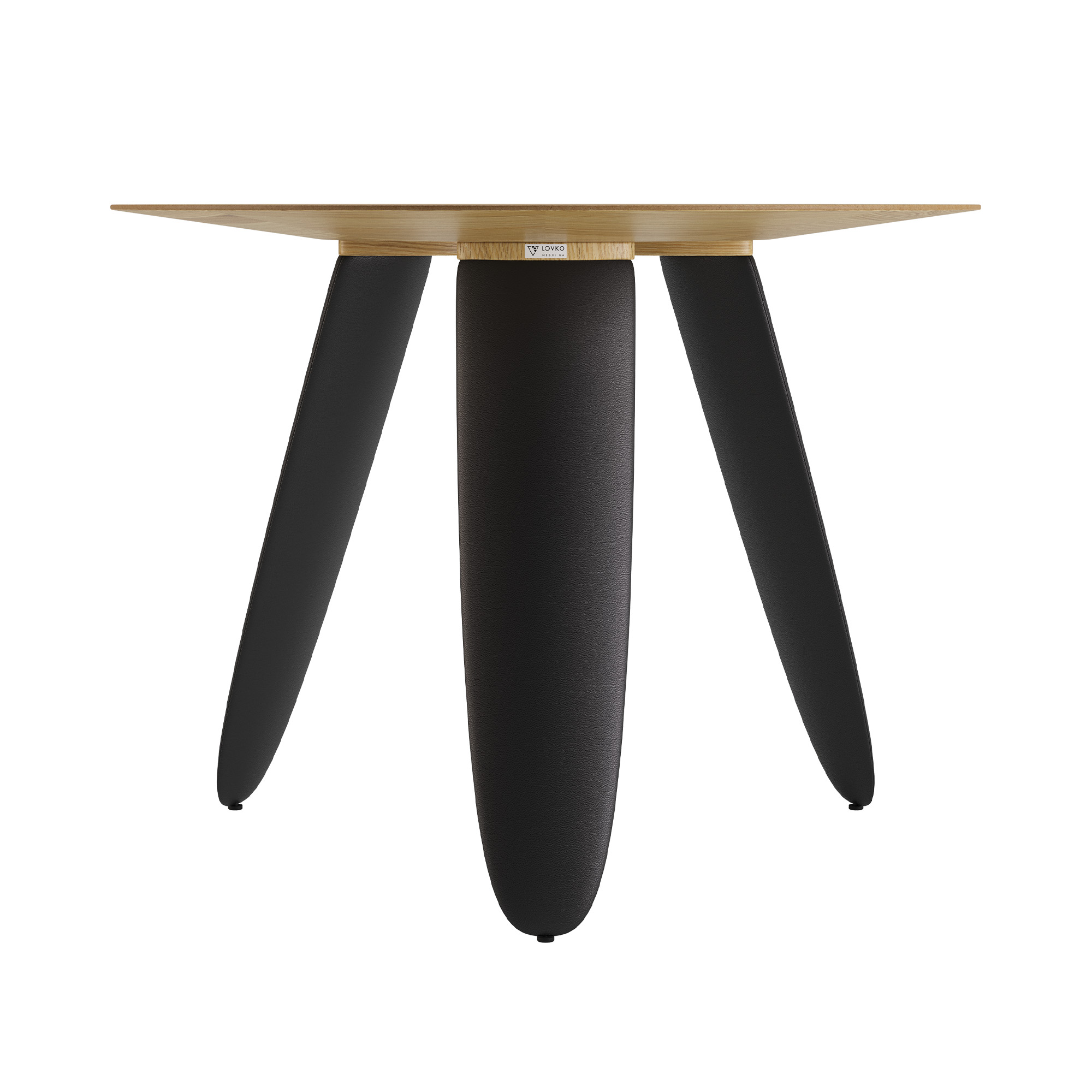 Kolm massiivset ebatavalise kujuga jalga lisavad kergust ja samal ajal stabiilsust. Jalad on puidust ja kaetud musta kunstnahaga.