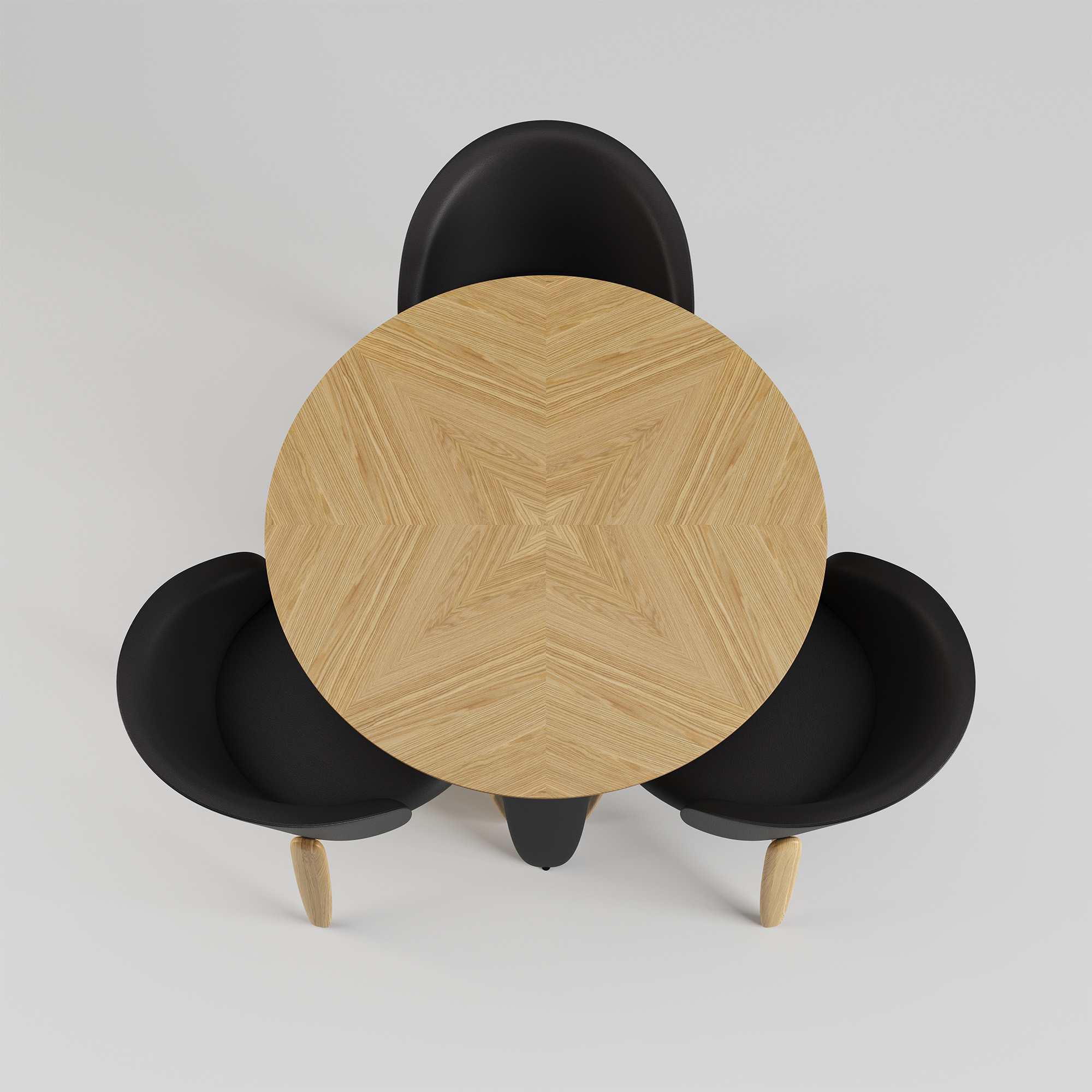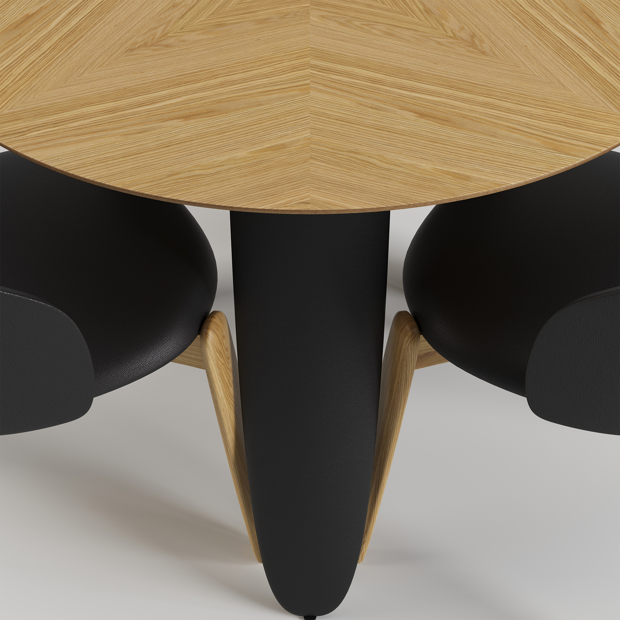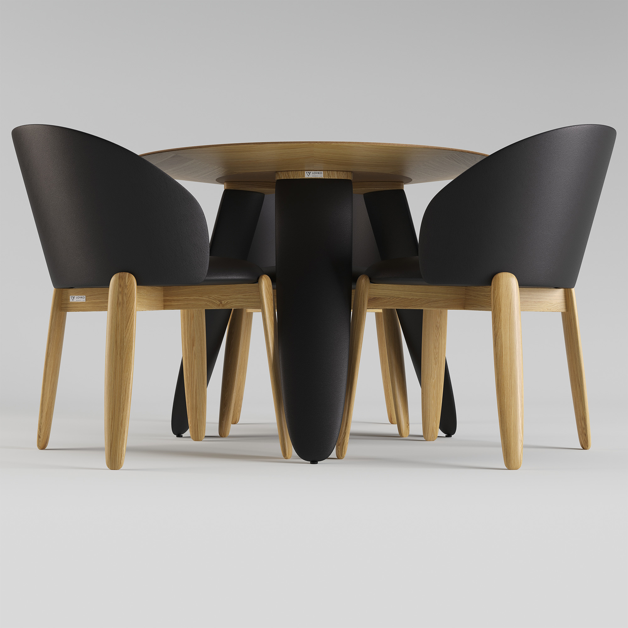 Kolm massiivset ebatavalise kujuga jalga lisavad kergust ja samal ajal stabiilsust. Jalad on puidust ja kaetud musta kunstnahaga.
